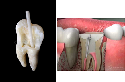 This treatment is done in a root canal treated tooth ( though not necessary in every case) where there is not enough tooth structure present. A post is inserted after removal of the root canal filling, up to 2/3 length of the root. After that a filling is done over it.